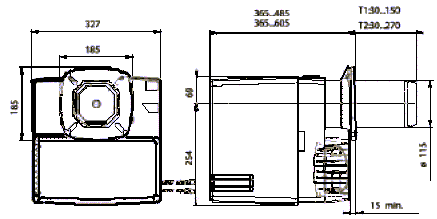 • 该燃烧器通过一个夹紧法兰安装于锅炉前面板,适用于多种伸进长度
